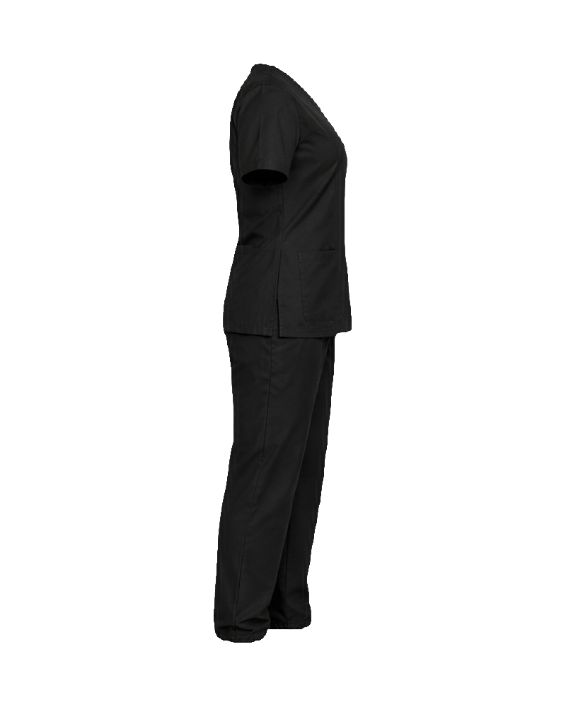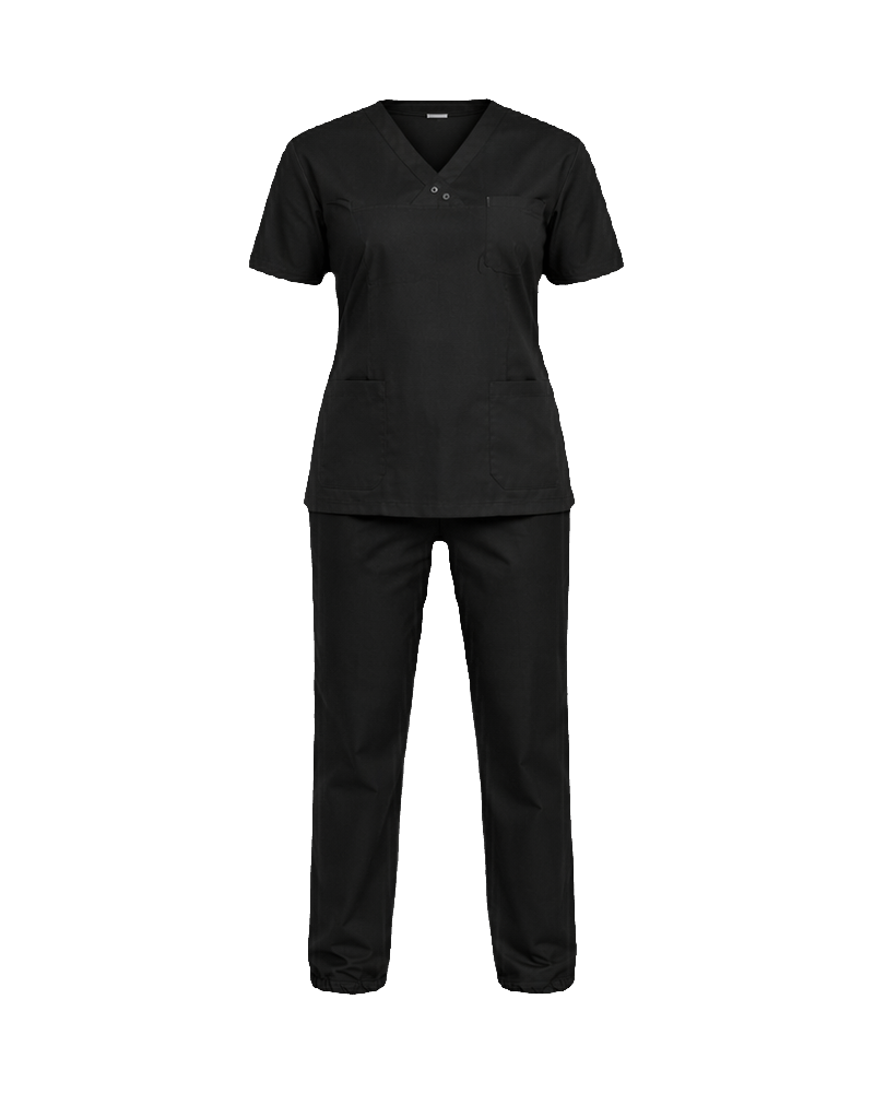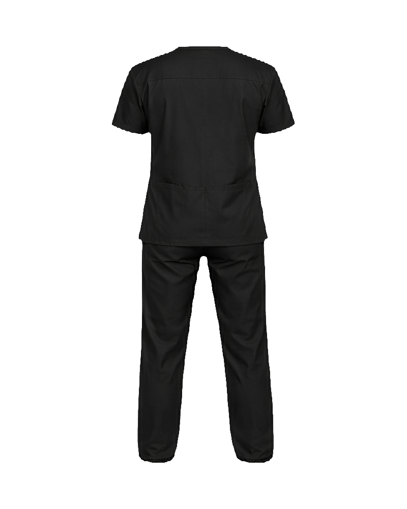 The design features a V-neck top with functional pockets for everyday tools and essentials, paired with matching trousers that offer a relaxed, ergonomic fit. The minimalist silhouette and smooth construction provide a professional appearance while prioritizing comfort, making this set a reliable choice for daily medical use.