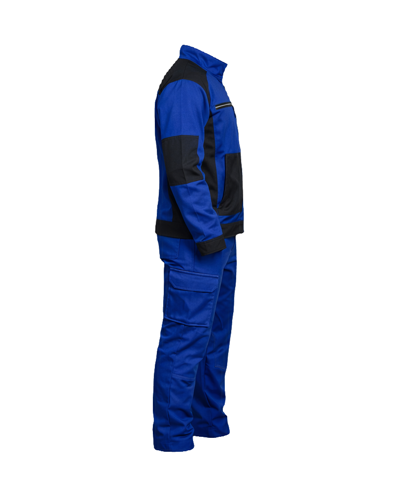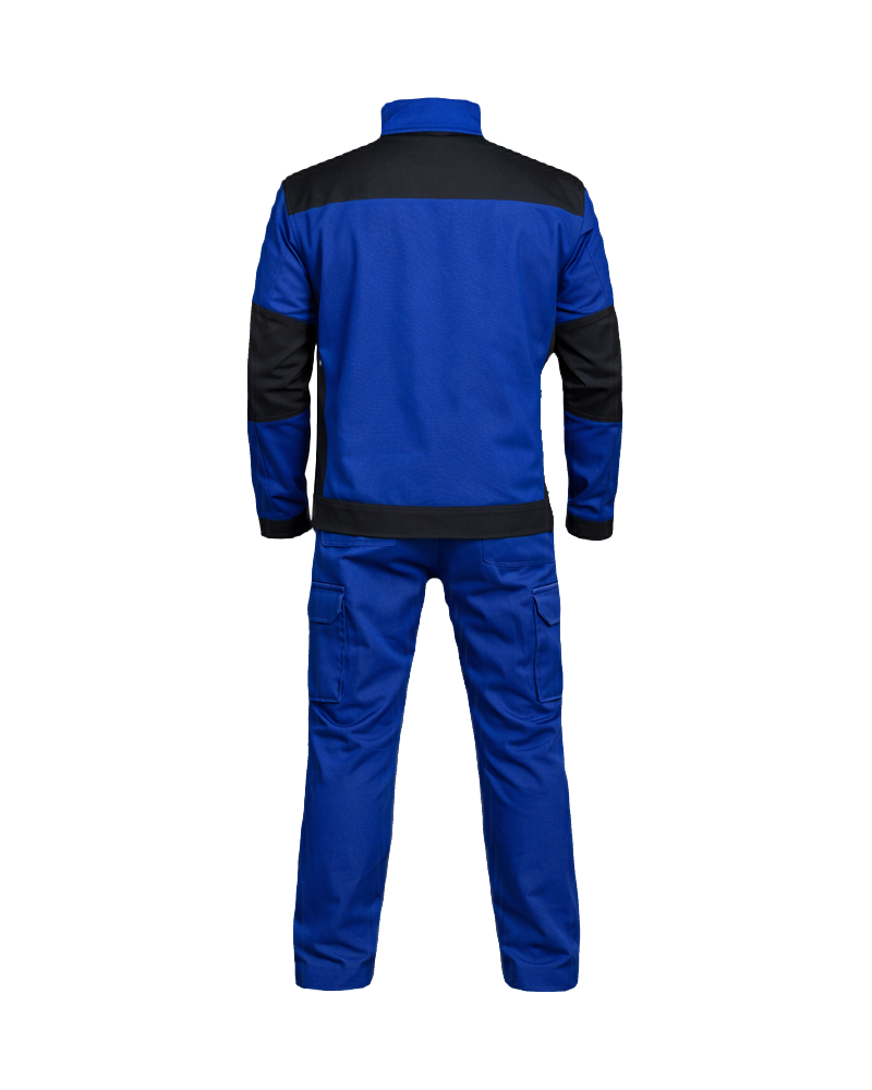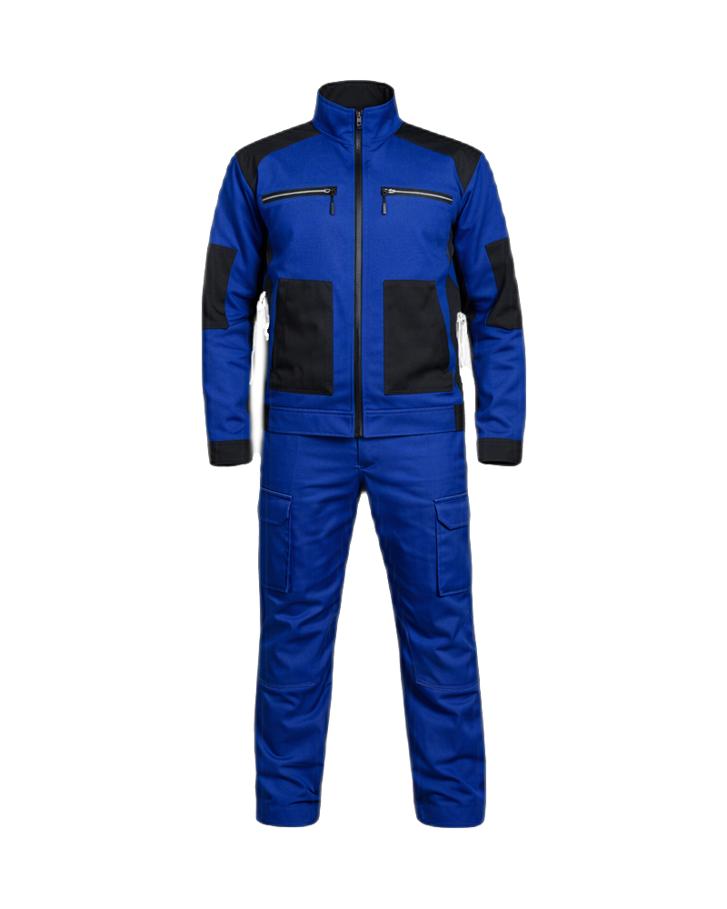 Made from durable, wear-resistant fabric, the set provides long-lasting performance while maintaining comfort throughout extended shifts. The jacket features a high stand-up collar, reinforced panels, and multiple zippered and utility pockets for secure storage, while the trousers are ergonomically shaped with practical cargo pockets, ensuring freedom of movement and efficient functionality in demanding work conditions.