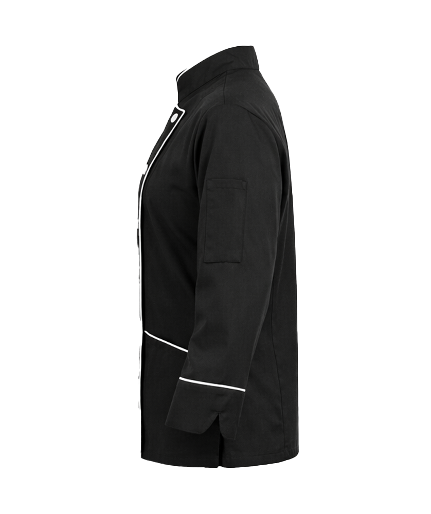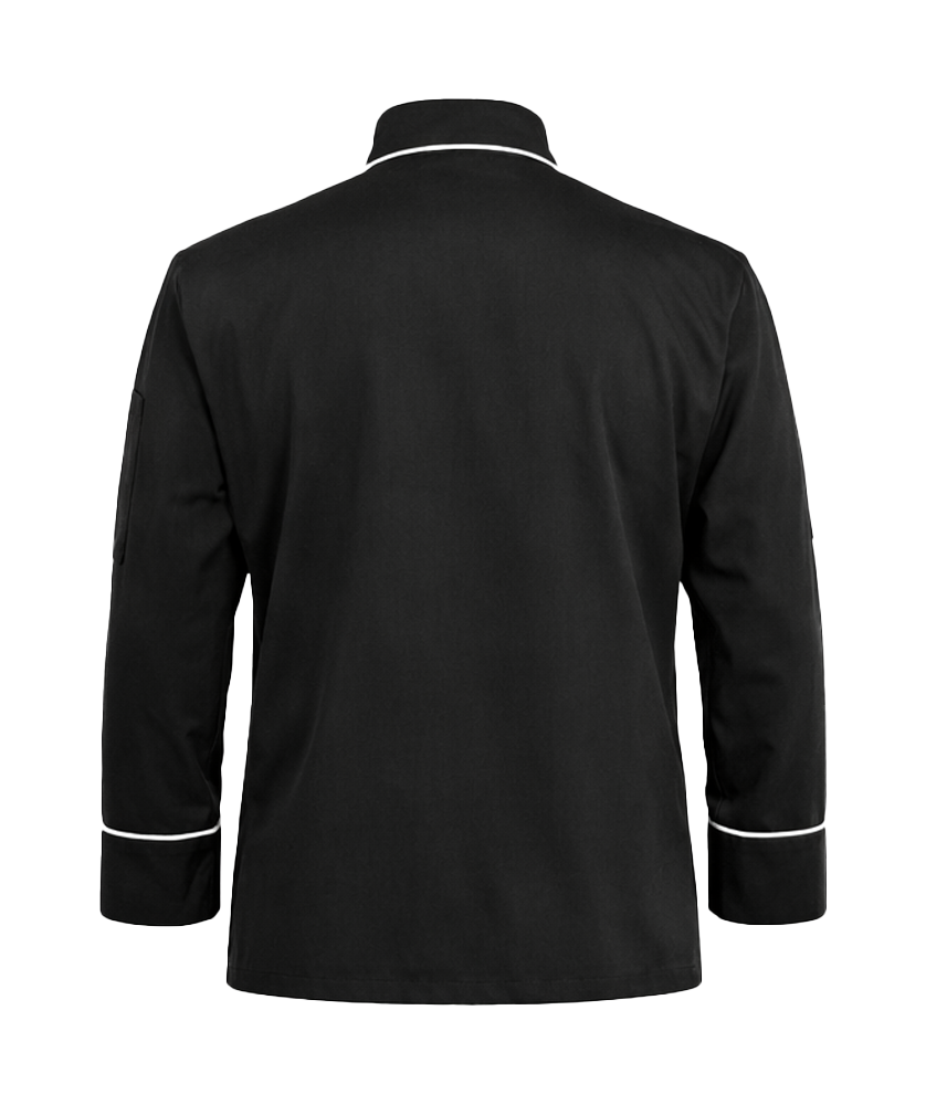 - Stand collar with contrast trim for a classic chef style.