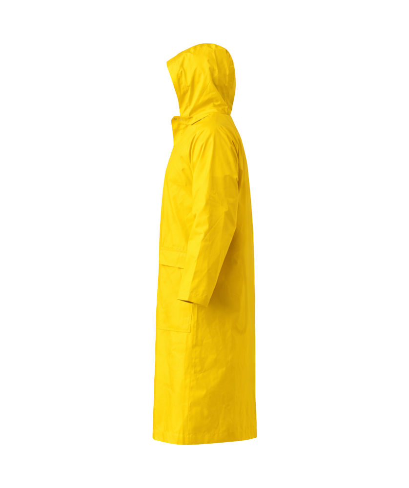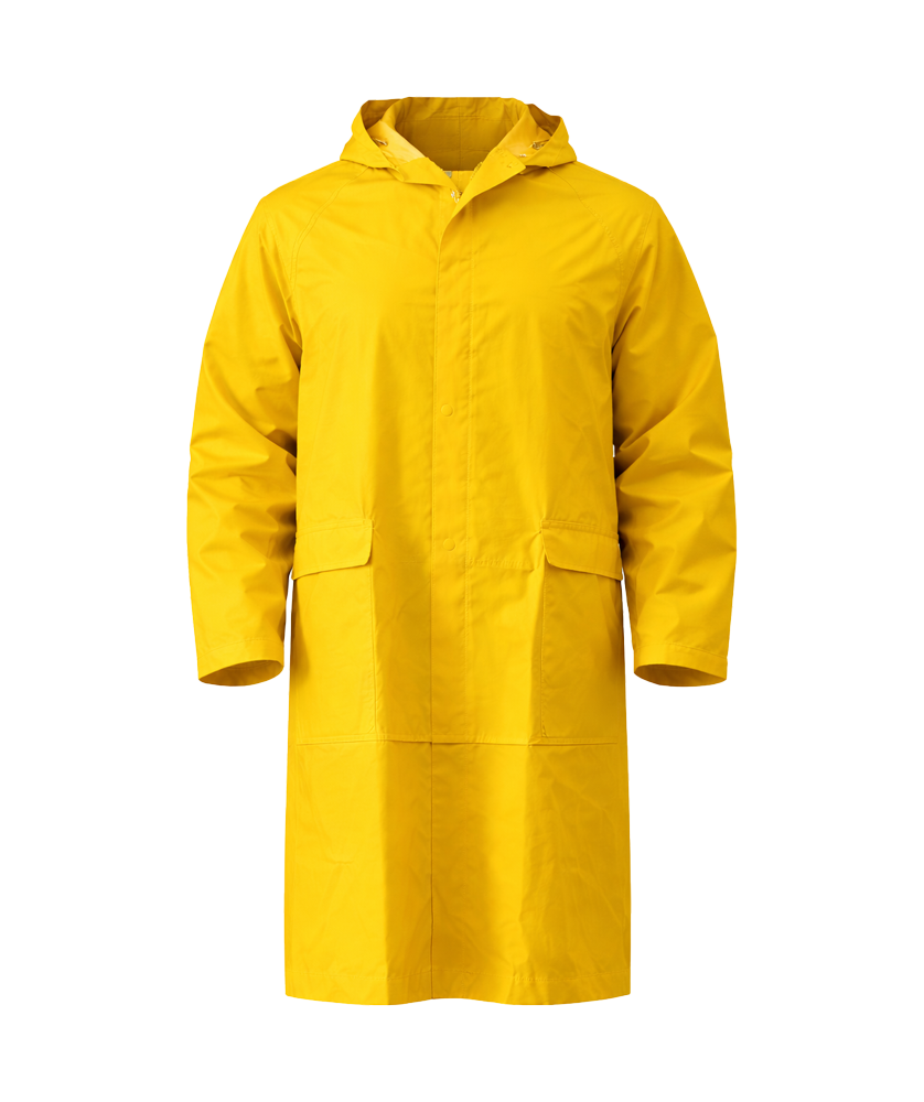Made from durable, water-resistant material, the coat provides effective protection while remaining comfortable during extended wear. The integrated hood, secure front closure, and practical length help shield the body from wind and rain, ensuring dependable performance throughout the working day.