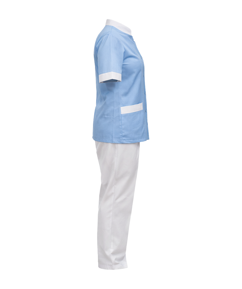 Made from smooth, breathable fabric, the set ensures comfort during long shifts while maintaining a tidy silhouette. The short-sleeve jacket features a structured collar, secure button closure, and functional front pockets for small essentials, while the straight-cut trousers provide ease of movement. The practical design supports daily wear, frequent washing, and consistent professional presentation.